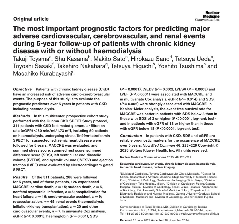 Toyama T, Kasama S, Sato M, Sano H, Ueda T, Sasaki T, Nakahara T, Higuchi T, Tsushima, Kurabayashi M: The most important prognostic factors for predicting major adverse cardiovascular, cerebrovascular, and renal events during 5-year follow-up of patients with chronic kidney disease with or without hemodialysis Nucl Med Commun. 2025 Mar 1; 46(3): 223-229